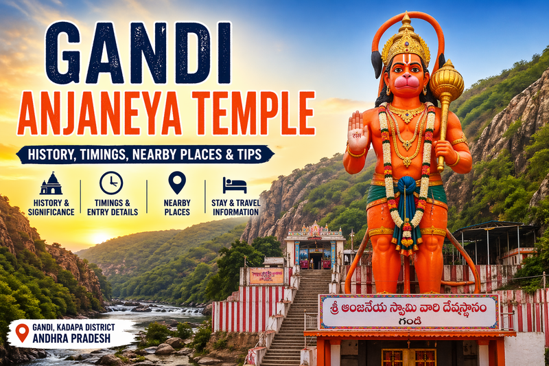 The Gandi Anjaneya Temple is a famous Hindu temple dedicated to Lord Hanuman, located in the scenic valley of Gandi in Andhra Pradesh. Nestled between beautiful hills and the Penna River, this temple is known for its peaceful surroundings and strong spiritual vibe. It is believed that Lord Hanuman himself manifested here, making it a powerful place for devotees seeking strength, courage, and protection. The temple attracts visitors not only for its religious importance but also for its natural beauty and calm atmosphere. Many pilgrims visit this temple during weekends and festivals to offer prayers and seek blessings. Whether you are a spiritual traveler or a nature lover, Gandi Anjaneya Temple offers a unique and refreshing experience.
